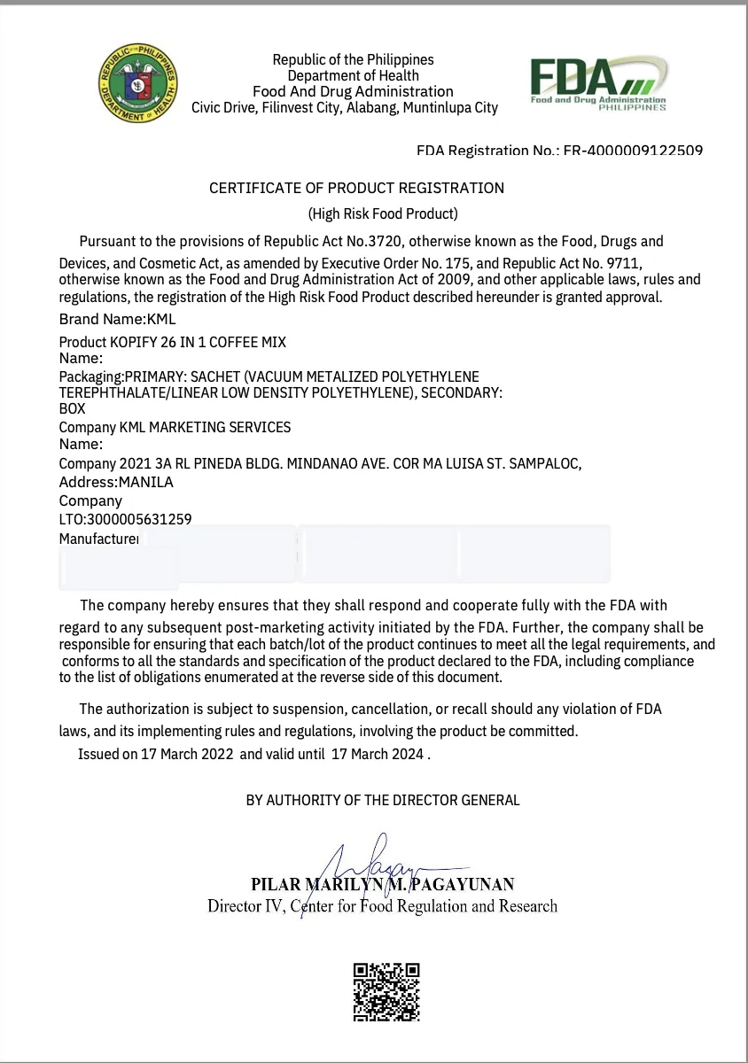Yes. We have License to Operate as a Food Trader and may Certificate of Product Registration (CPR) po ang Kopify sa FDA.
