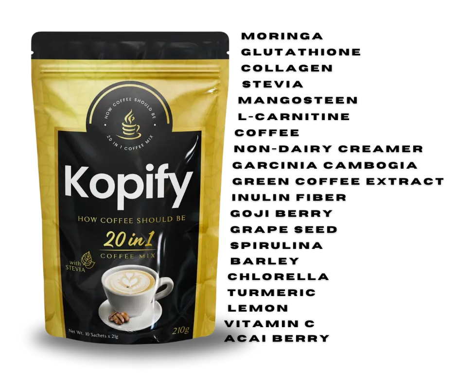 Kopify has collagen and glutathione as active ingredients na tumutulong for weight loss management and to lighten skin. With the help of caloric deficit, exercise and proper taking care of oneself, Kopify helps achieve and maintain ones weight and as added bonus, yes it helps lighten our skin - with consistent use.